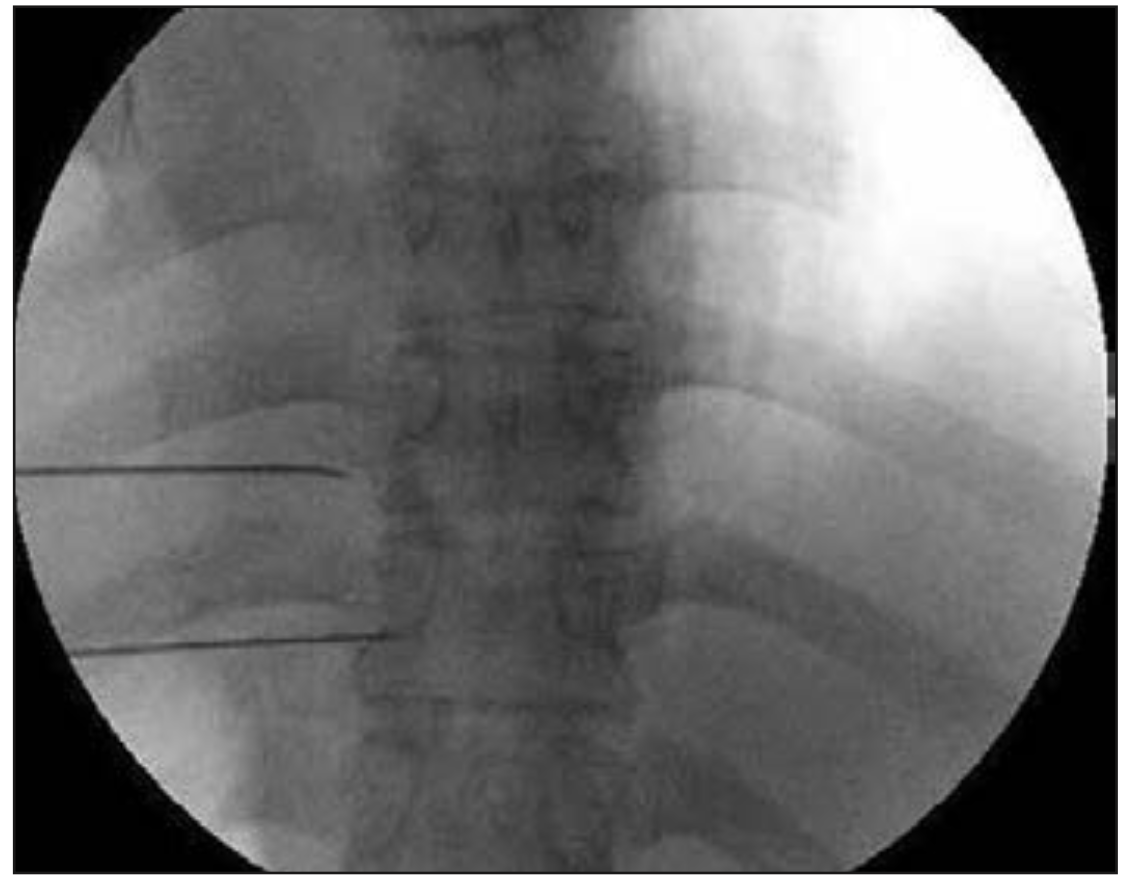 Figura 5. Visión fluoroscópica anteroposterior donde se observan cánulas de radiofrecuencia en espacio paravertebral (21).