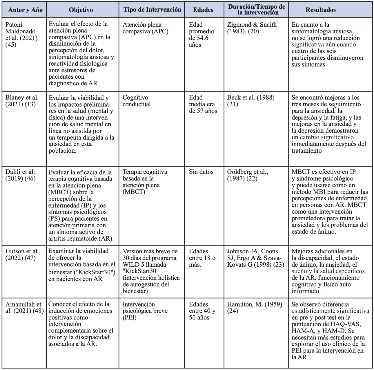 Tabla 2: Intervenciones psicológicas en el manejo de la ansiedad en pacientes con AR.